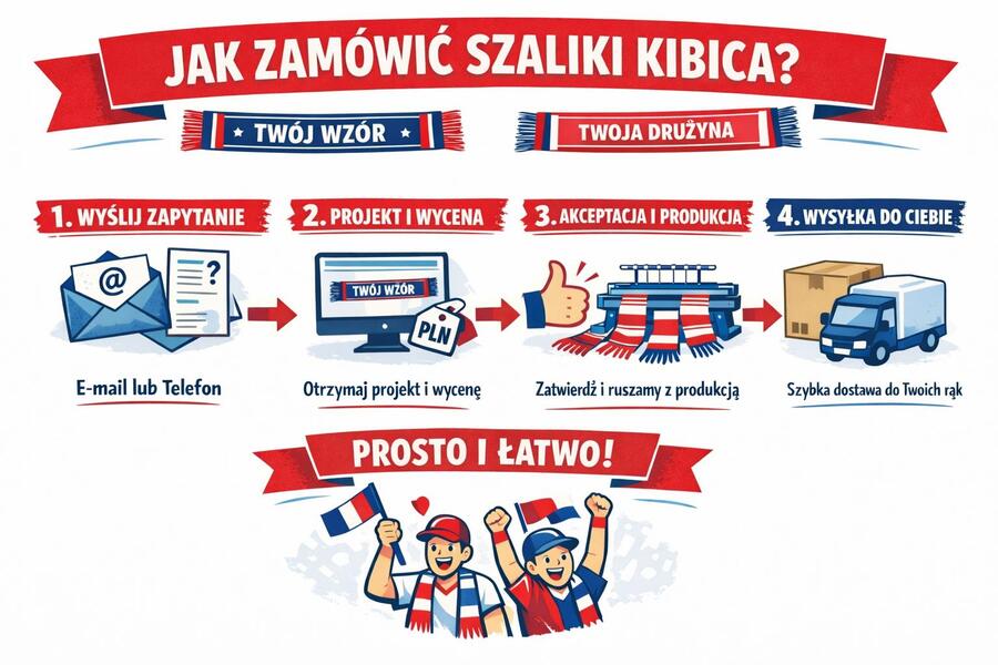 Szaliki na zamówienie to doskonały sposób na wyróżnienie się na stadionie, podczas wydarzeń sportowych czy imprez firmowych. Oferujemy profesjonalne szaliki na zamówienie, które powstają w oparciu o indywidualny projekt klienta – od kolorystyki, przez napisy, aż po logo klubu, drużyny lub firmy.